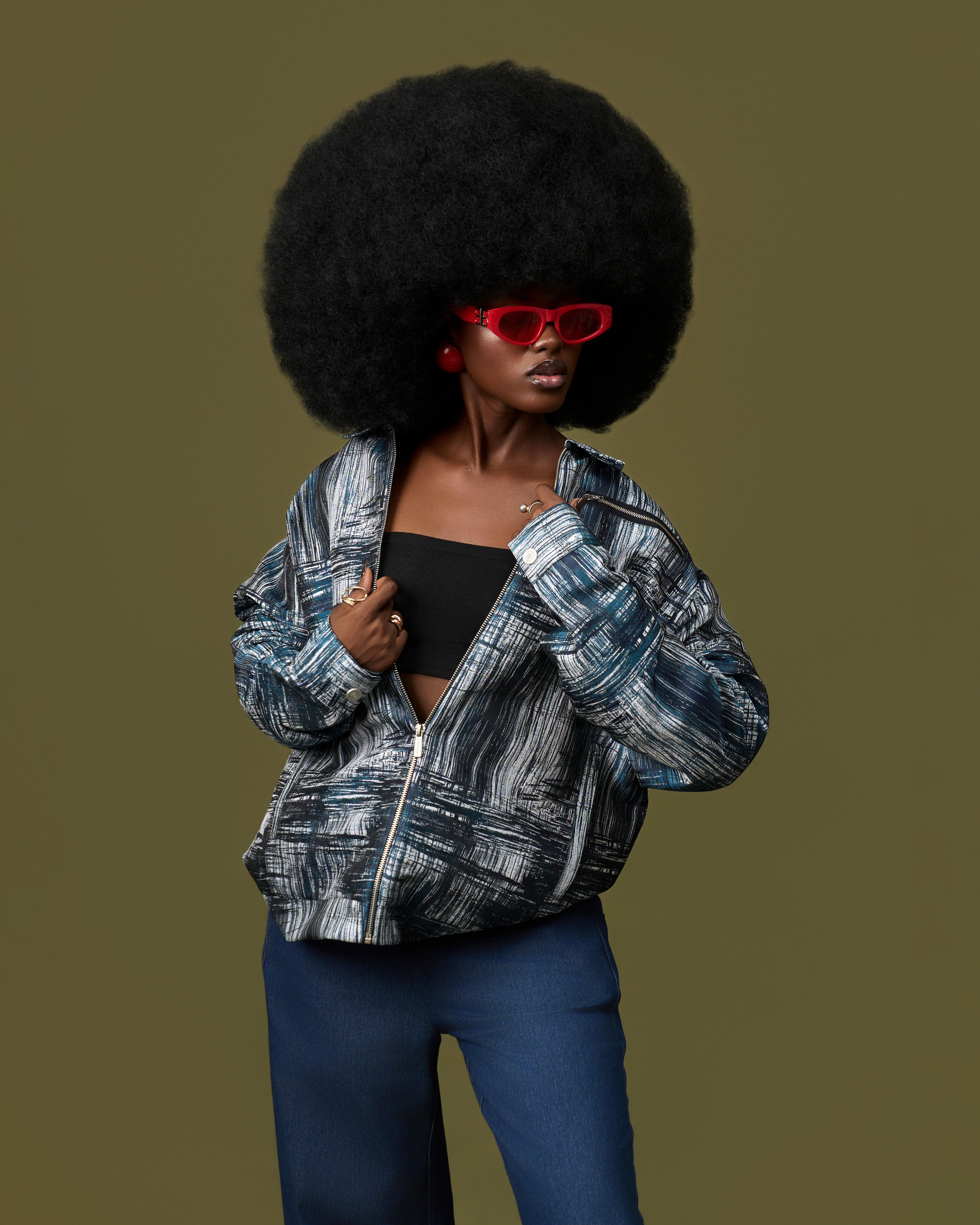 Veste zippée à motif abstrait bleu et blanc, portée avec un pantalon large aux accents imprimés en bas de jambe. Un style urbain chic et affirmé.
