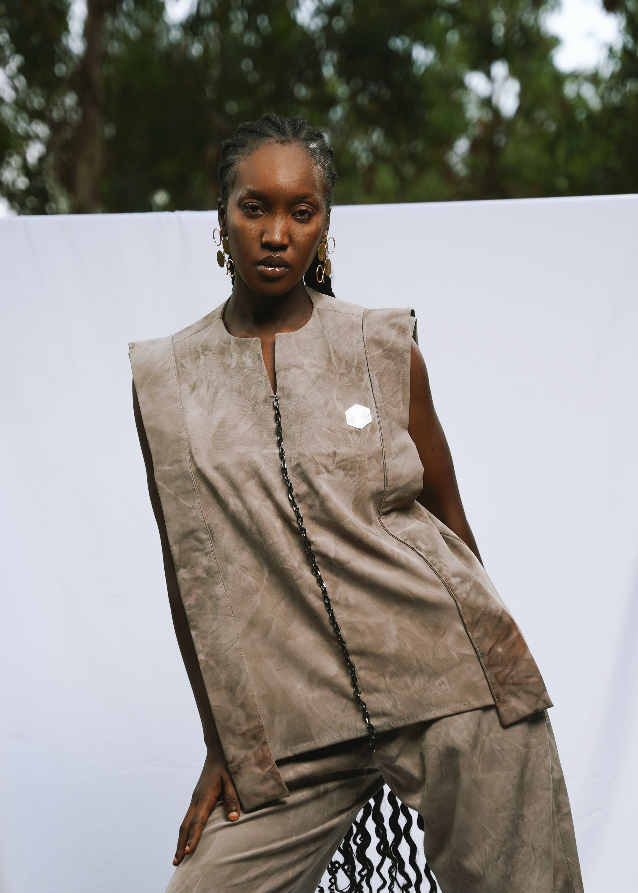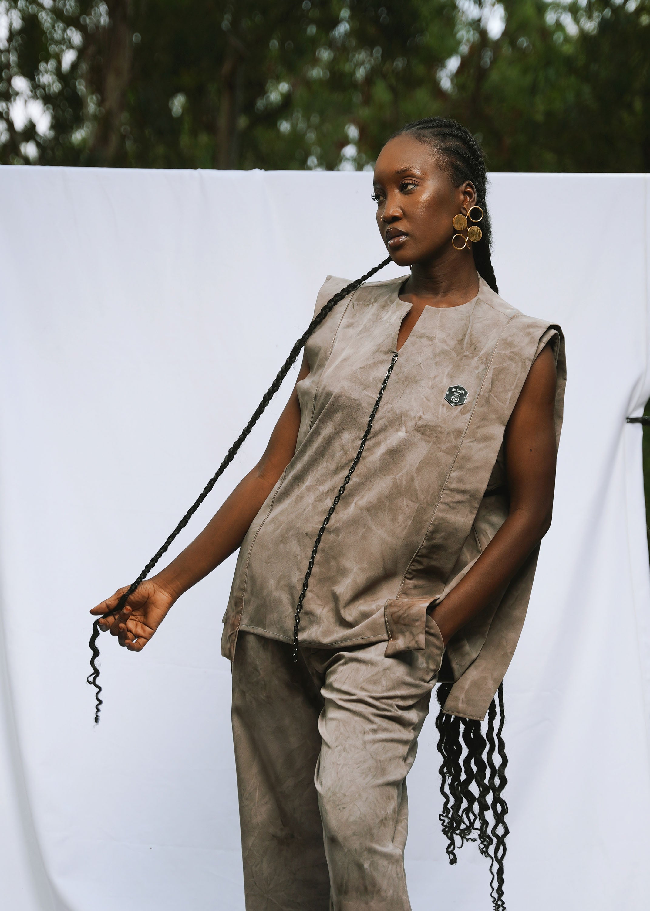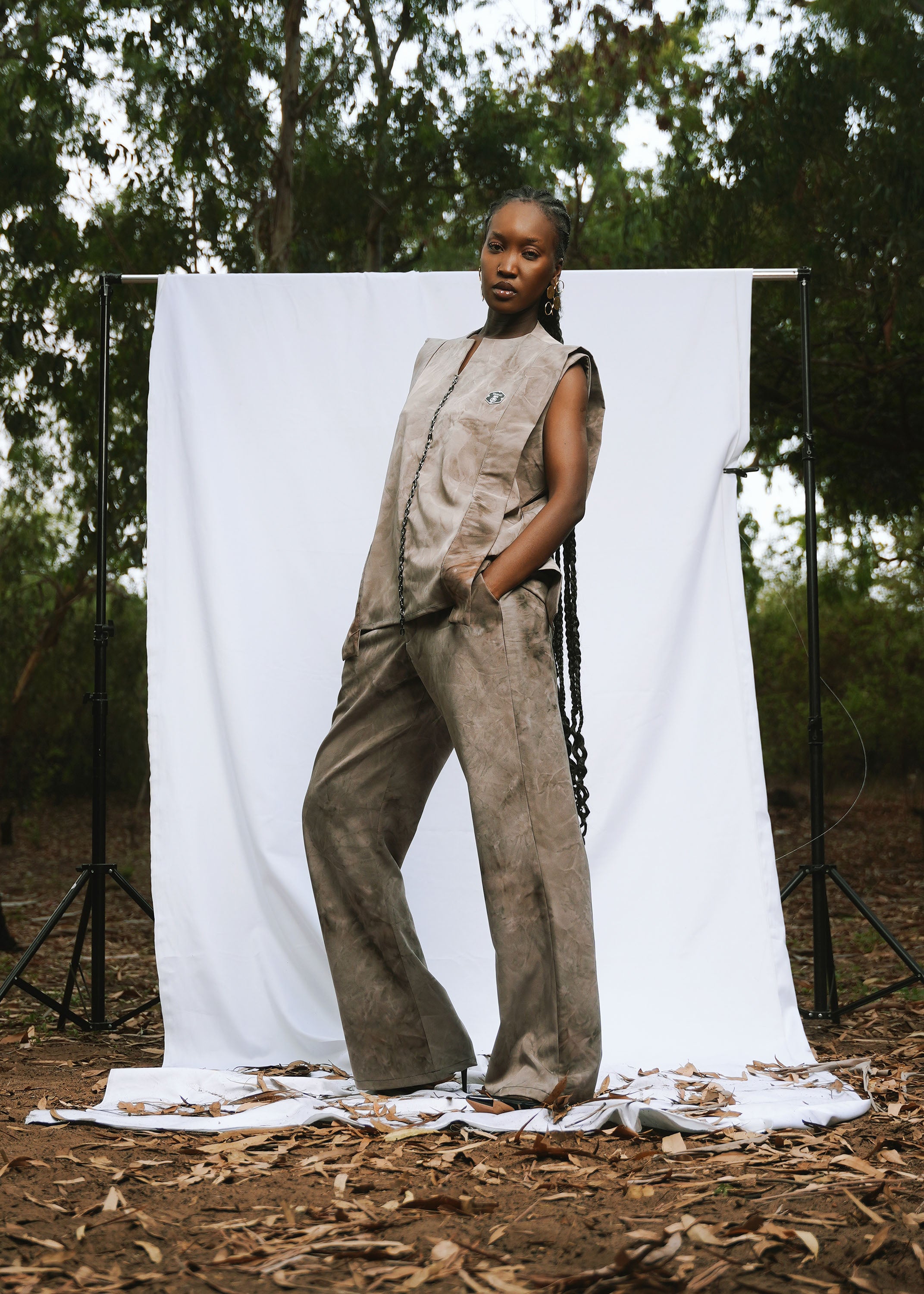 - Détails : : La tunique longue, fendue sur les côtés, se distingue par sa coupe épurée. Le pantalon droit, à la fois sobre et raffiné, allonge la silhouette avec une grande fluidité.