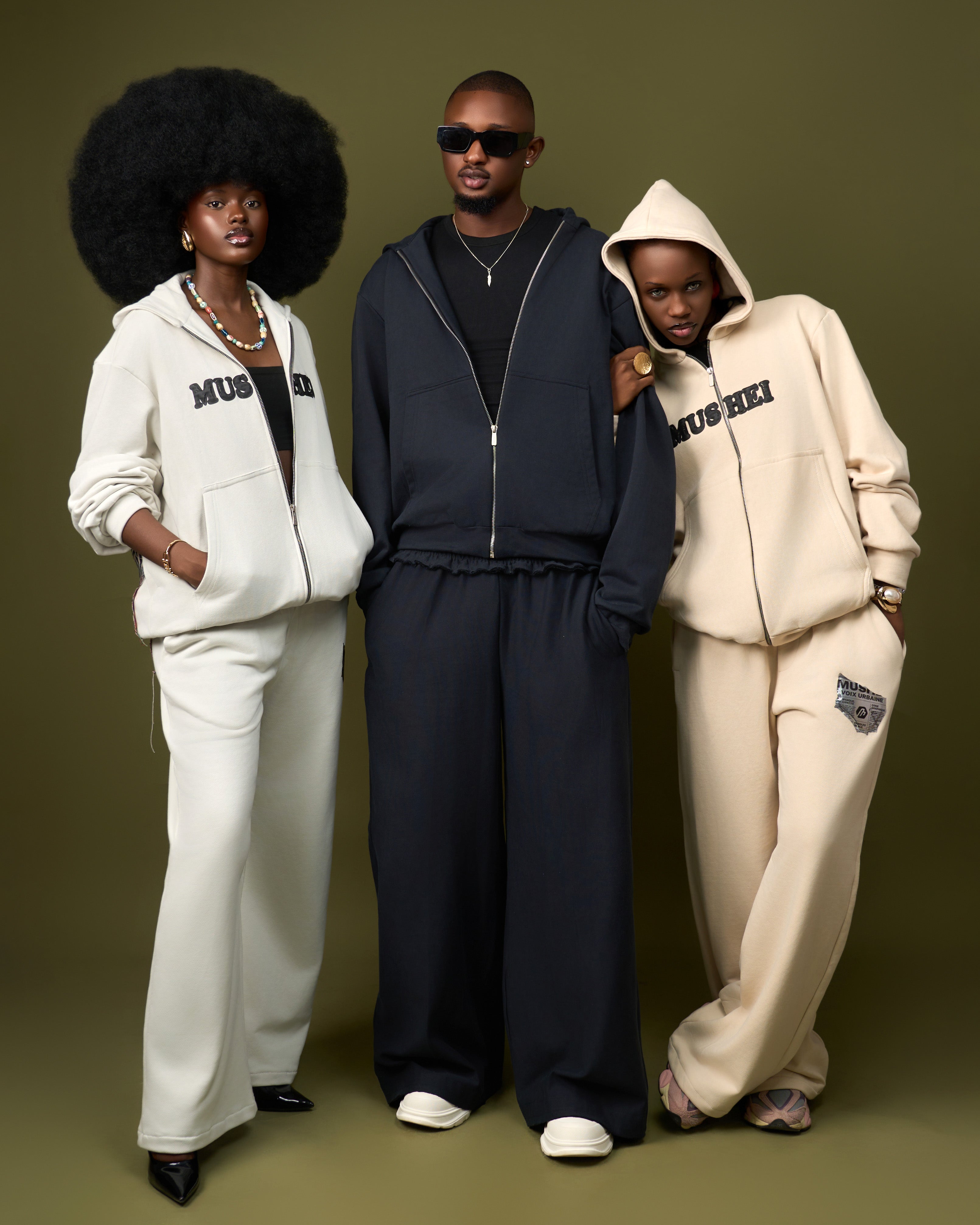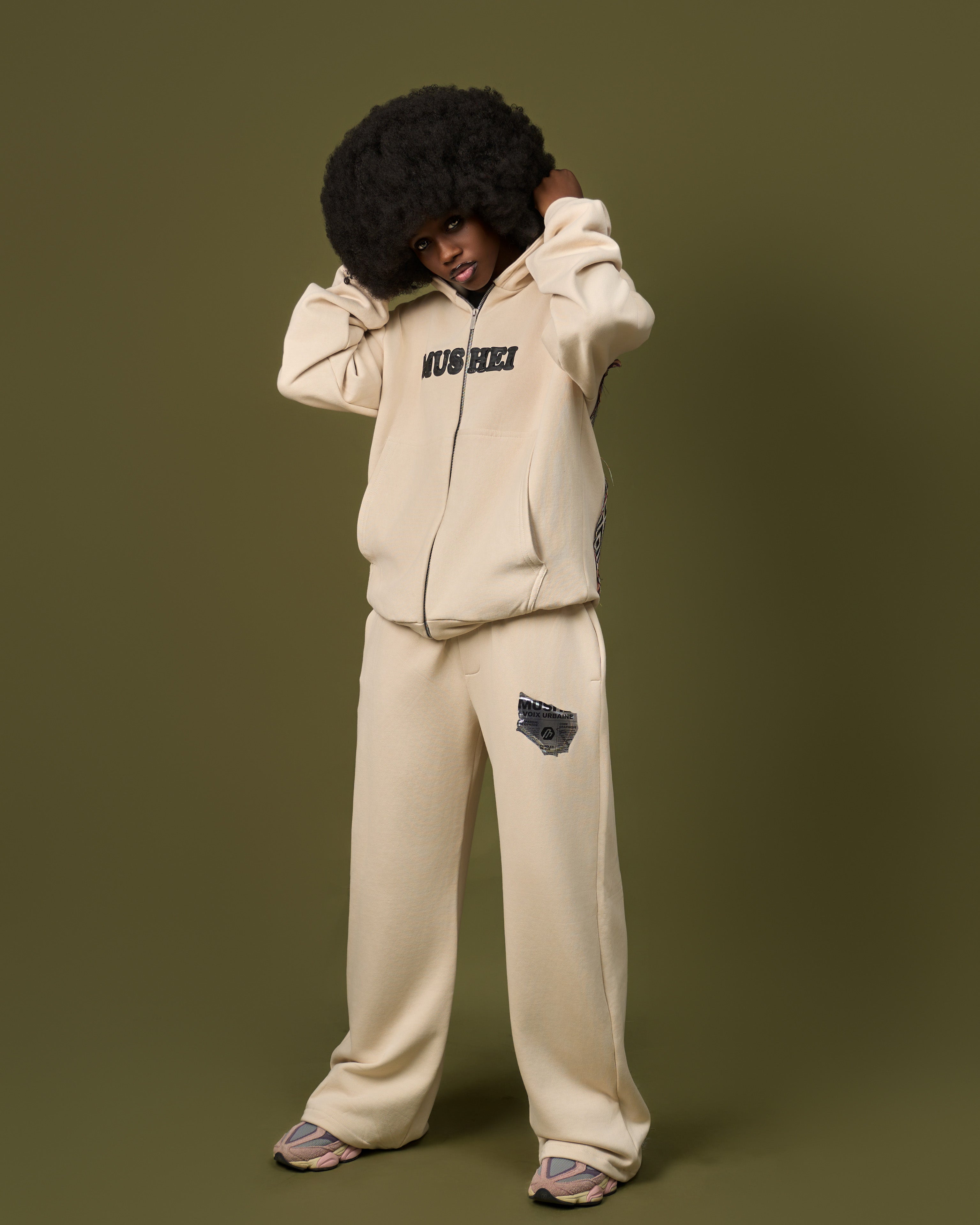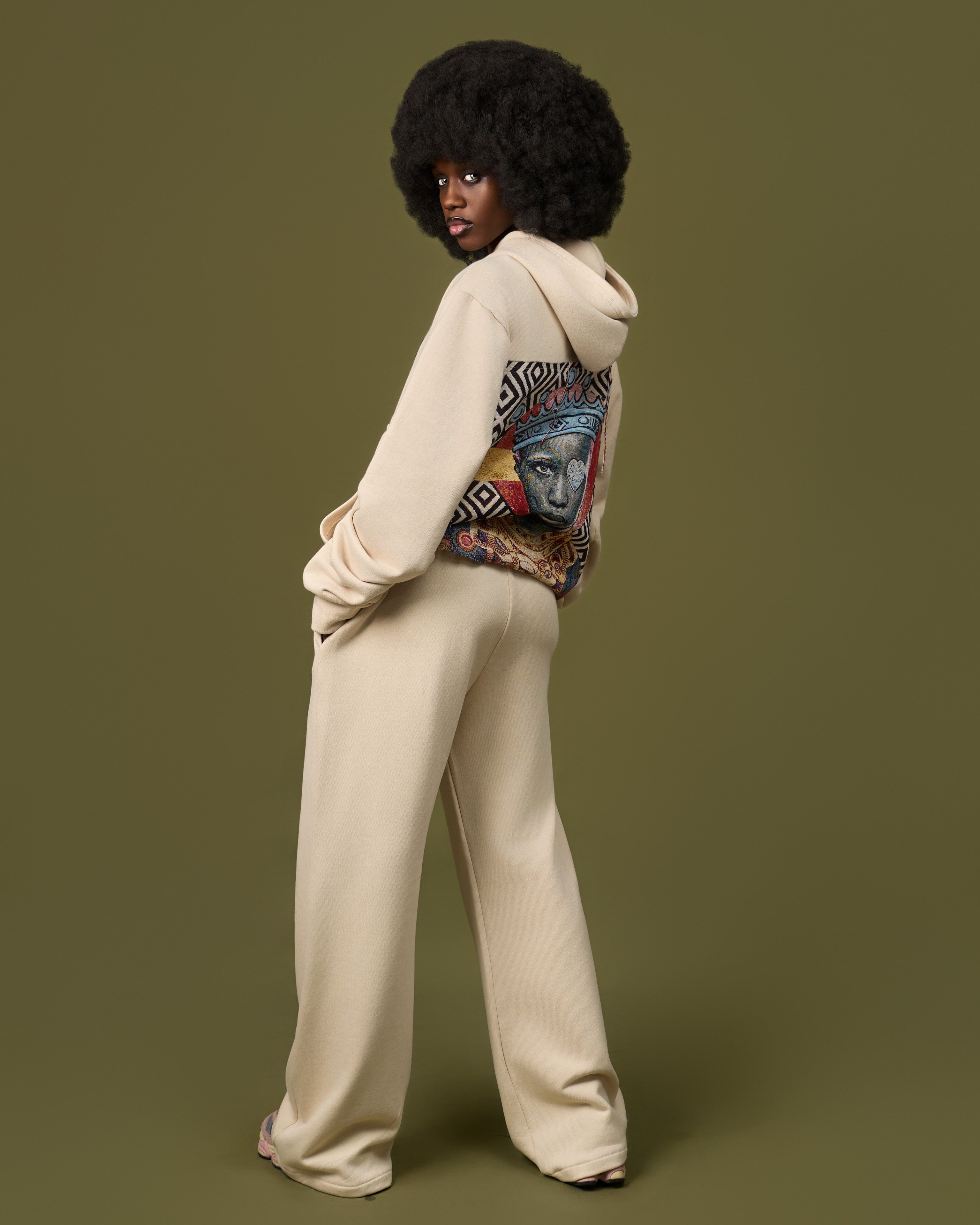 Ensemble sweat à capuche zippé et pantalon large. L'arrière révèle un motif culturel fort, faisant de cet ensemble une pièce maîtresse originale et confortable.