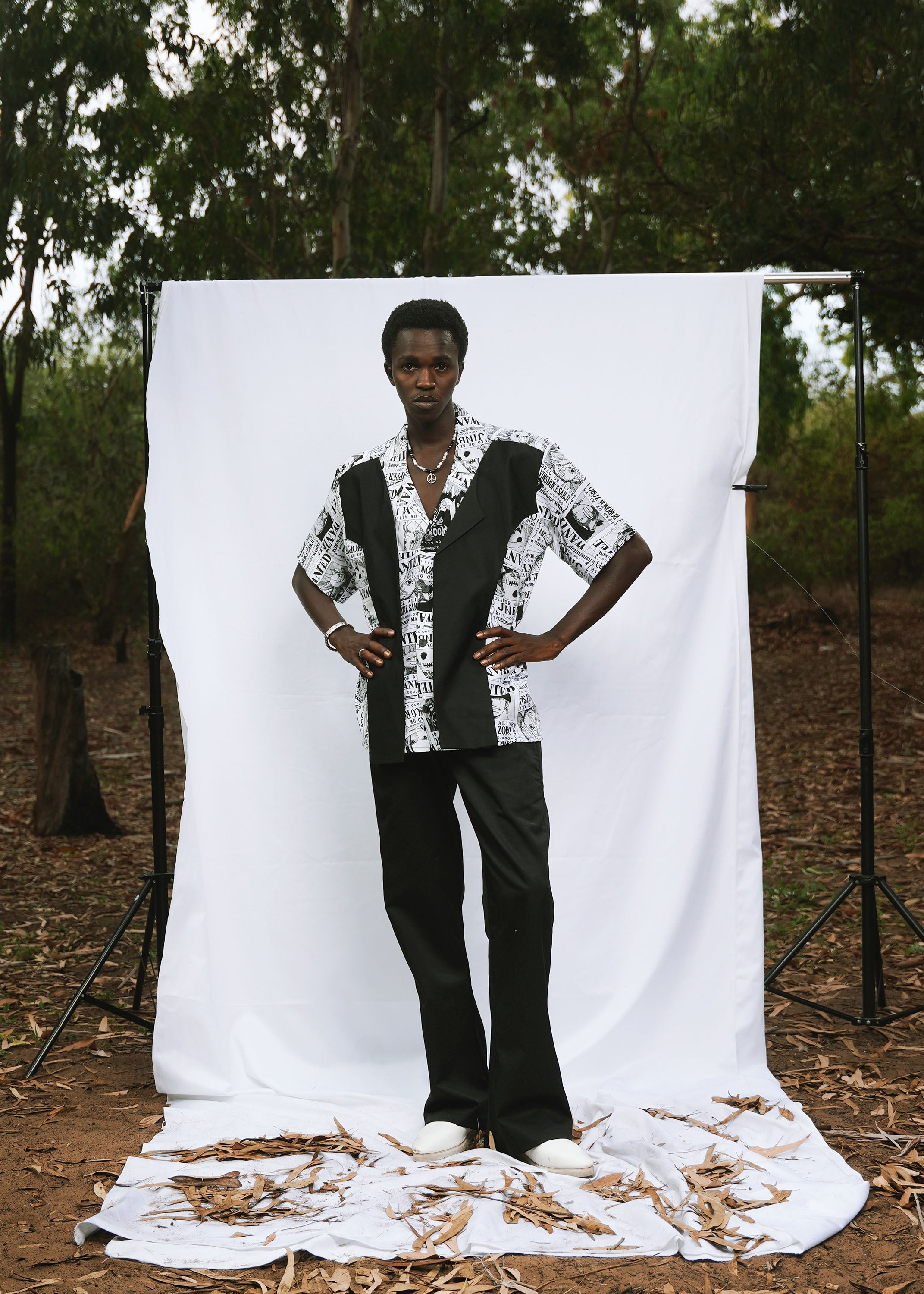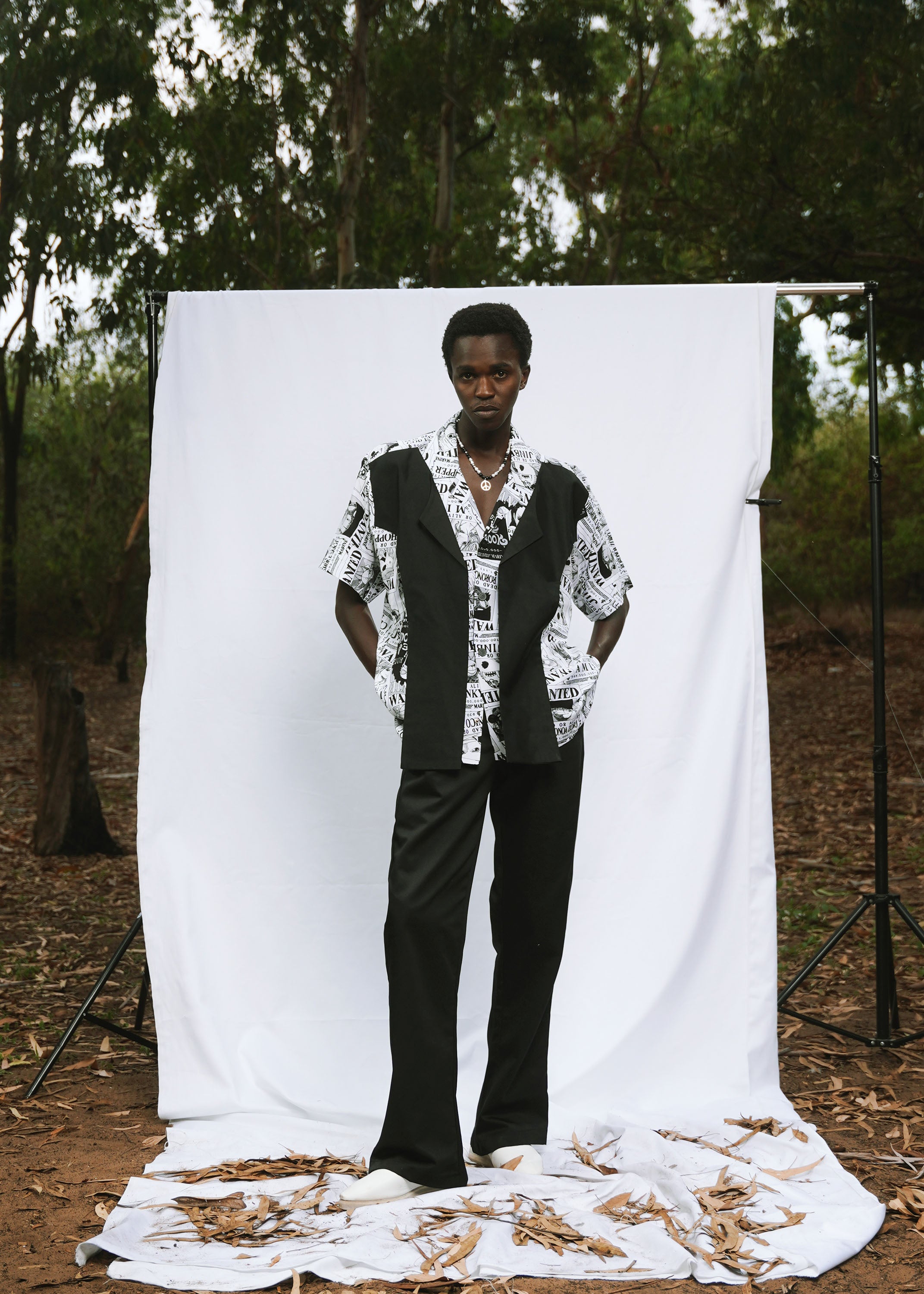 - Détails : : Chemise à motifs inspirés des affiches de rue, soulignée par des empiècements noirs contrastants ; pantalon droit noir, tombé fluide et affirmé