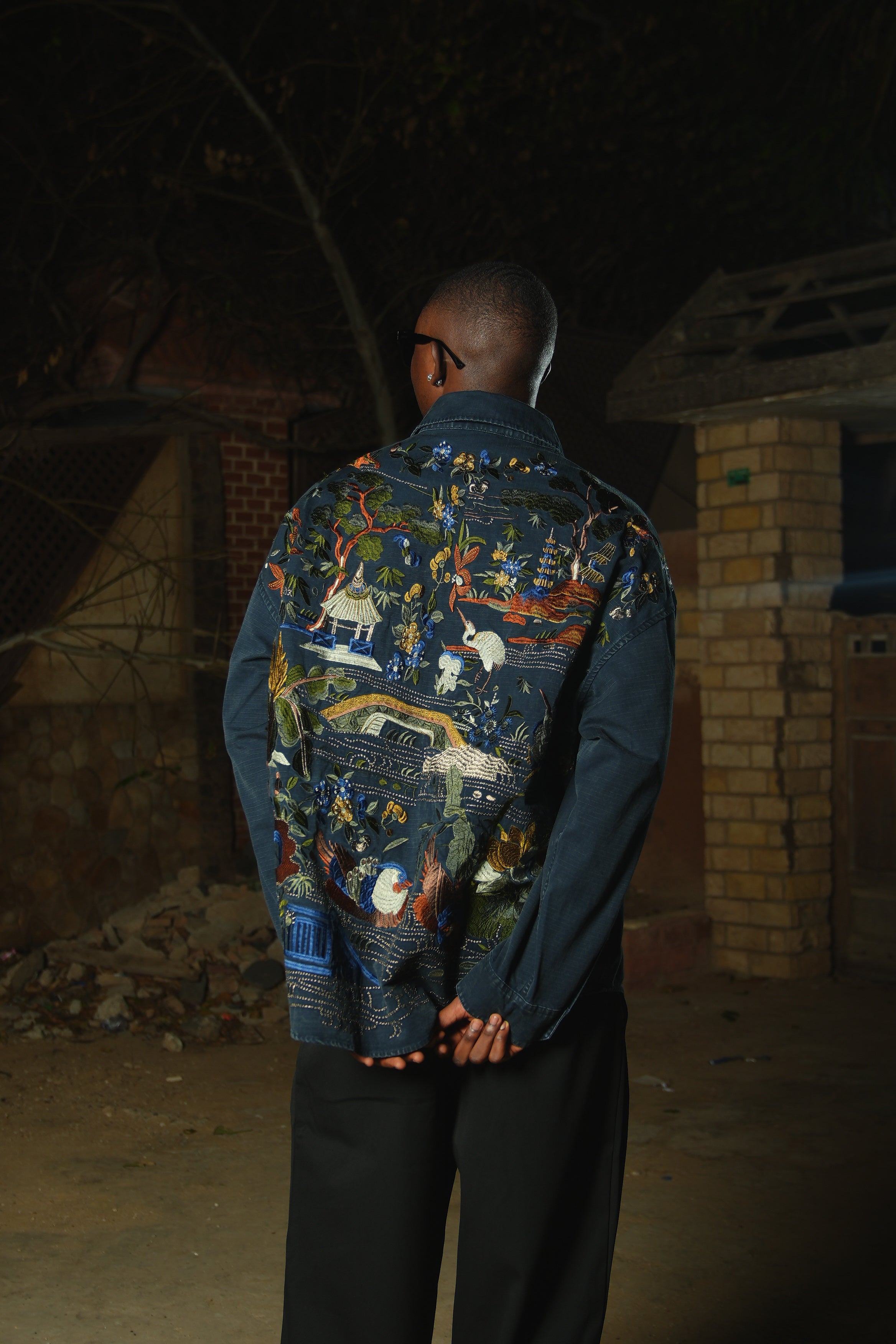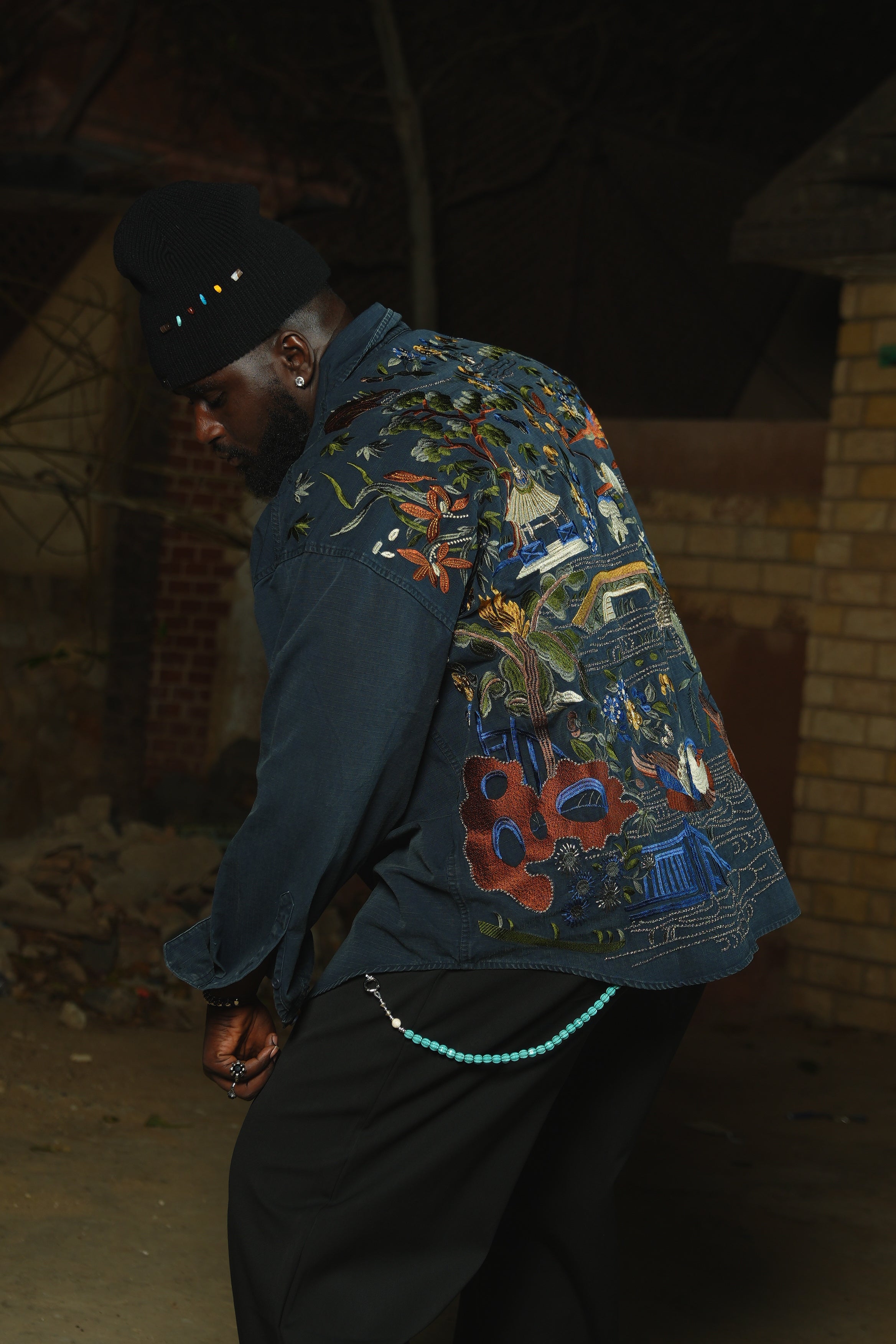 Le col est sublimé par des incrustations de pierres qui captent la lumière avec élégance. Le dos se distingue par des broderies minutieuses formant des motifs sophistiqués qui témoignent d'un savoir-faire remarquable.