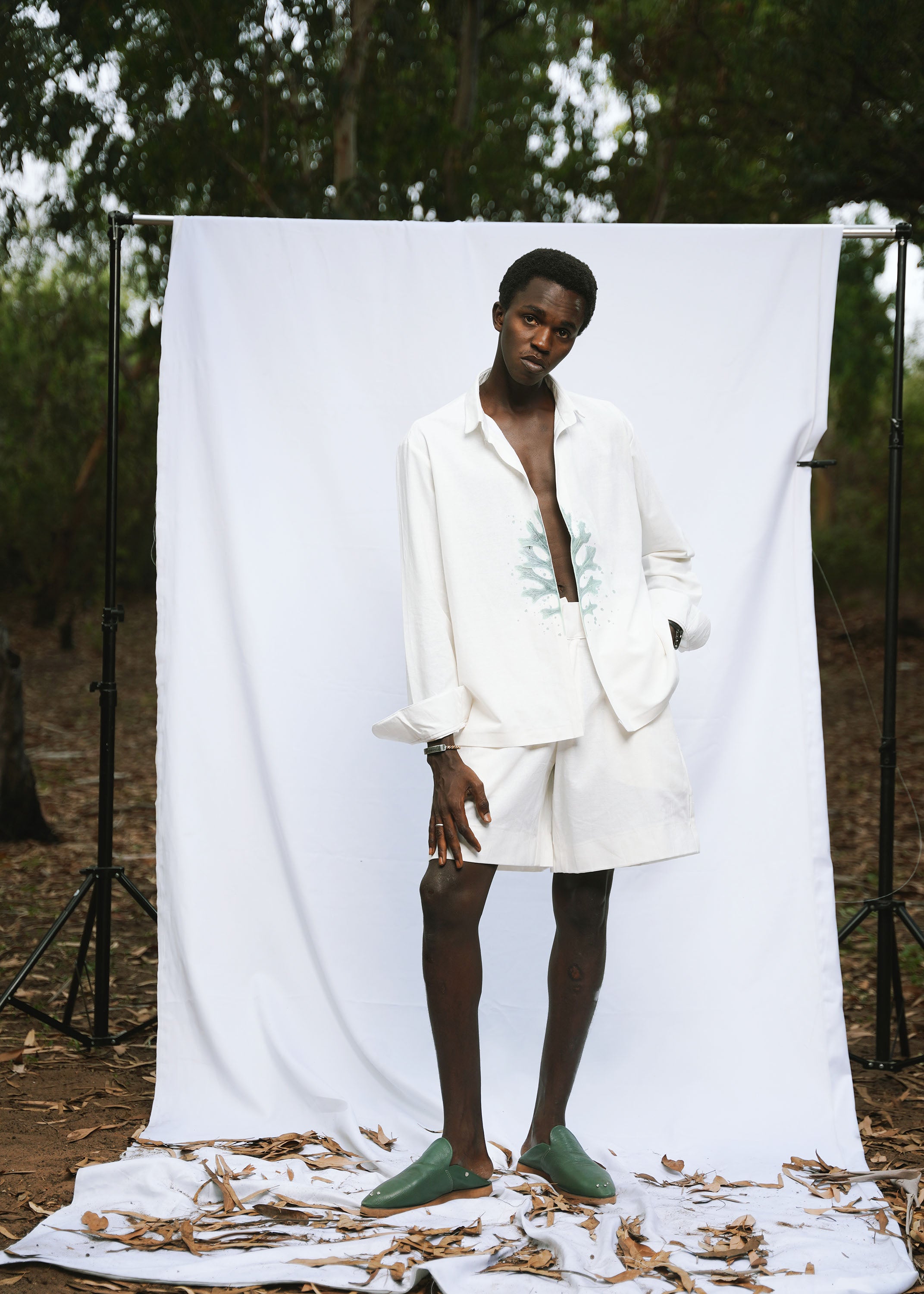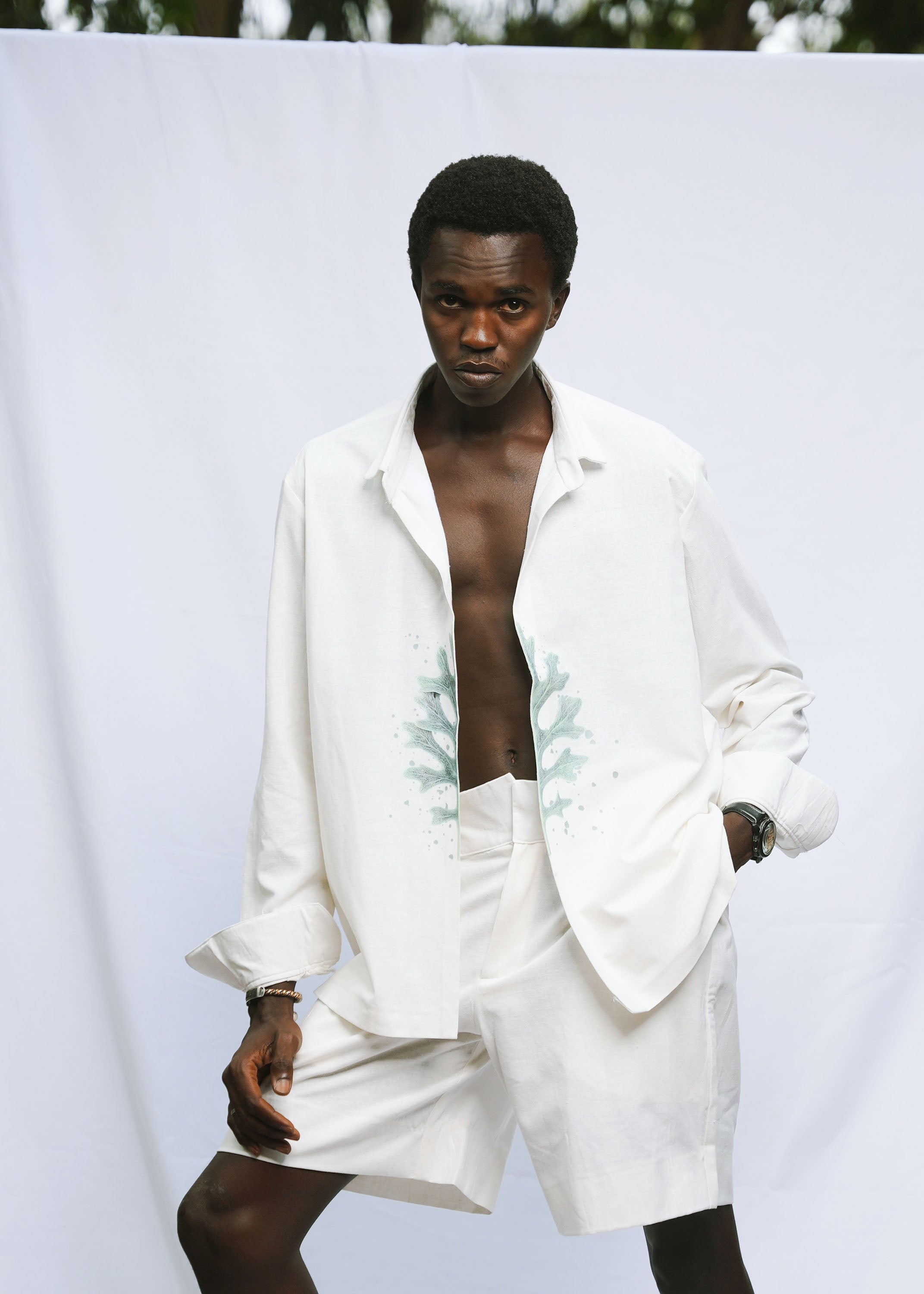 • Détails : : La chemise oversize blanche à col classique est ornée d’un motif graphique aquarelle vert placé le long de l’ouverture. Le short assorti, à la coupe ample et structurée.