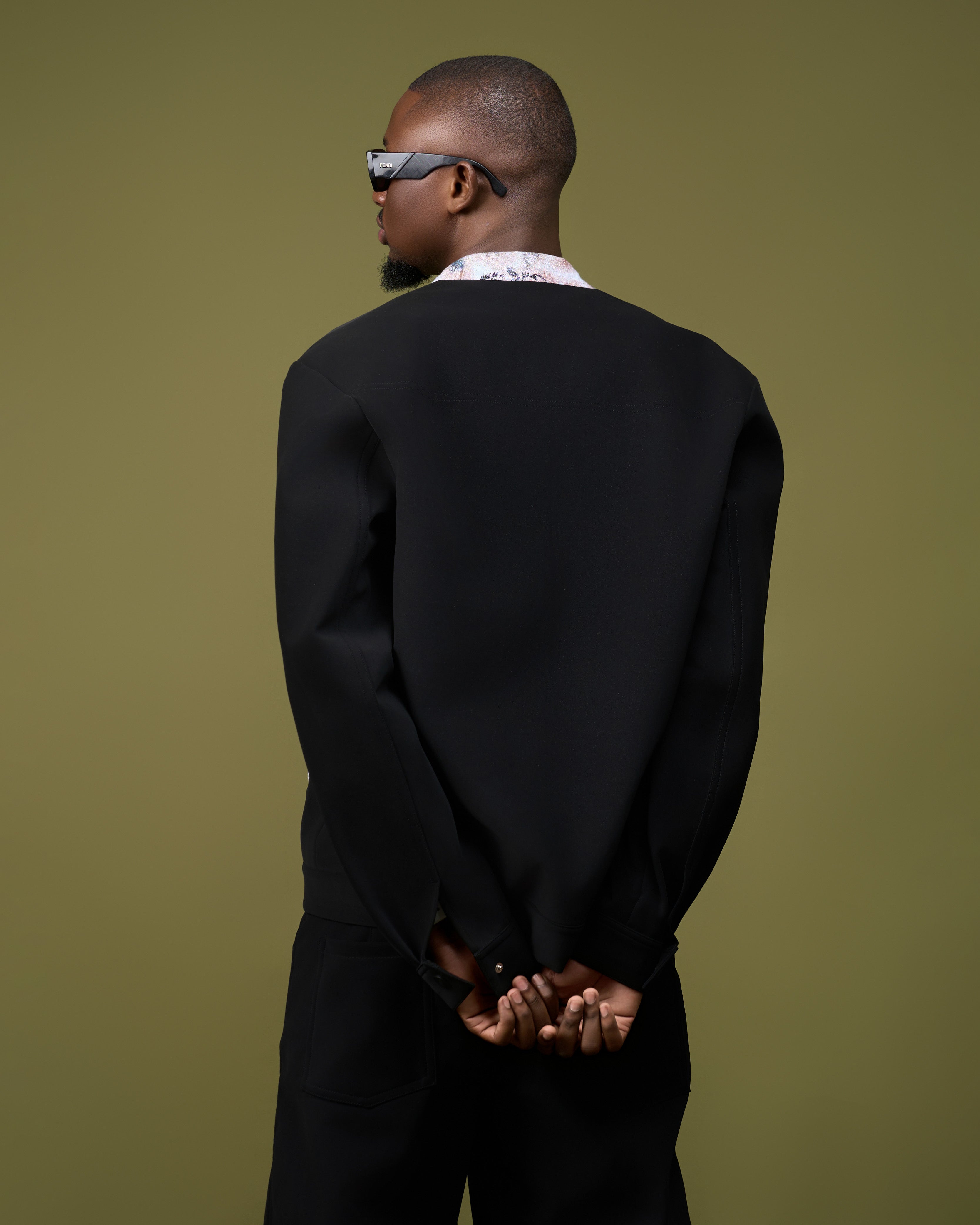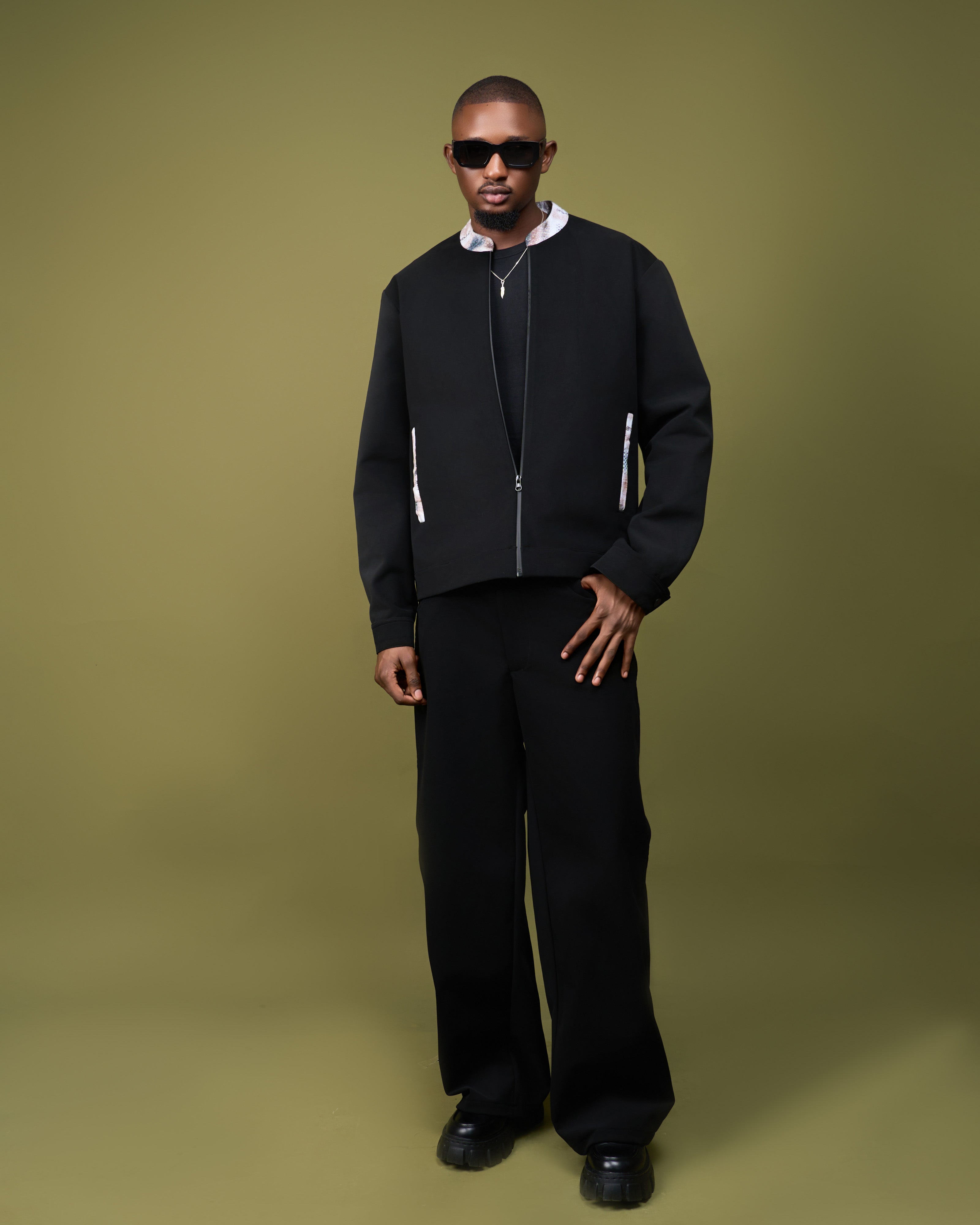 Ensemble monochrome noir composé d'un bomber zippé épuré et d'un pantalon large à la coupe fluide. Un look minimaliste et moderne, facile à styliser.